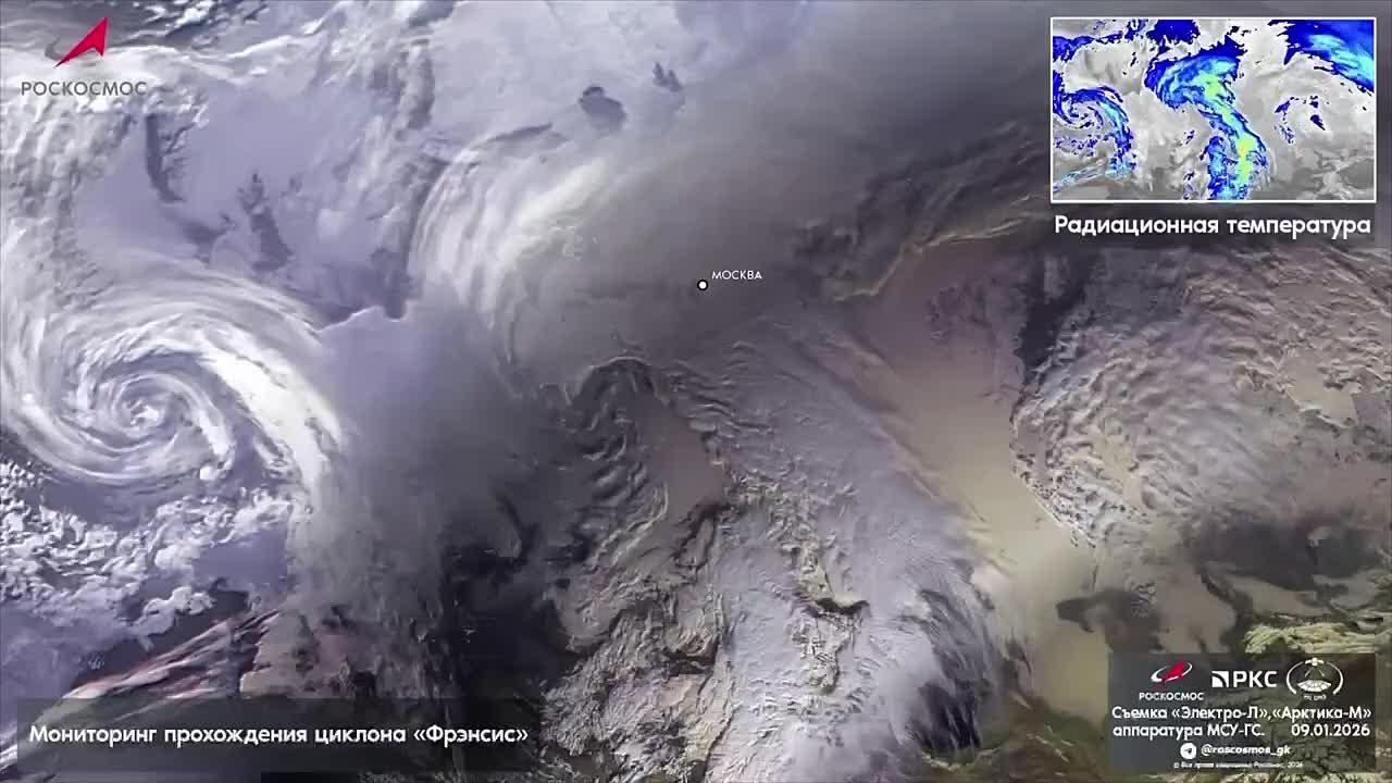 В госкорпорации сообщили, что прохождение циклона было зафиксировано спутниками «Электро-Л» и «Арктика-М». Белый вихрь отчётливо виден из космоса и охватывает значительную часть европейской территории страны.