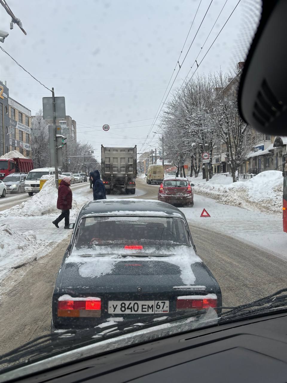 На нескольких смоленских улицах сегодня наступил транспортный коллапс. Очевидцы сообщали о пробках от улицы Румянцева до перекрестка Кирова и Гагарина.