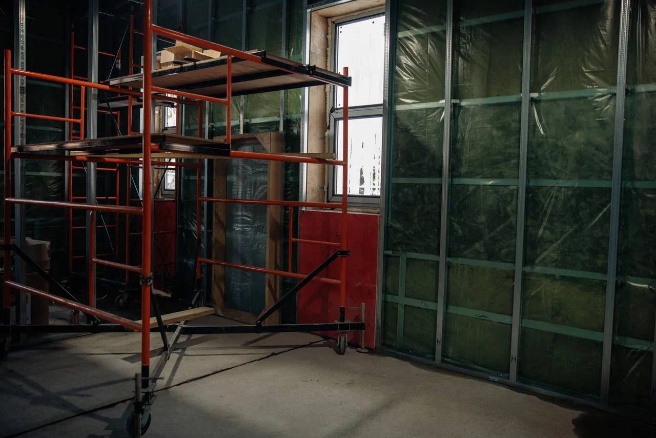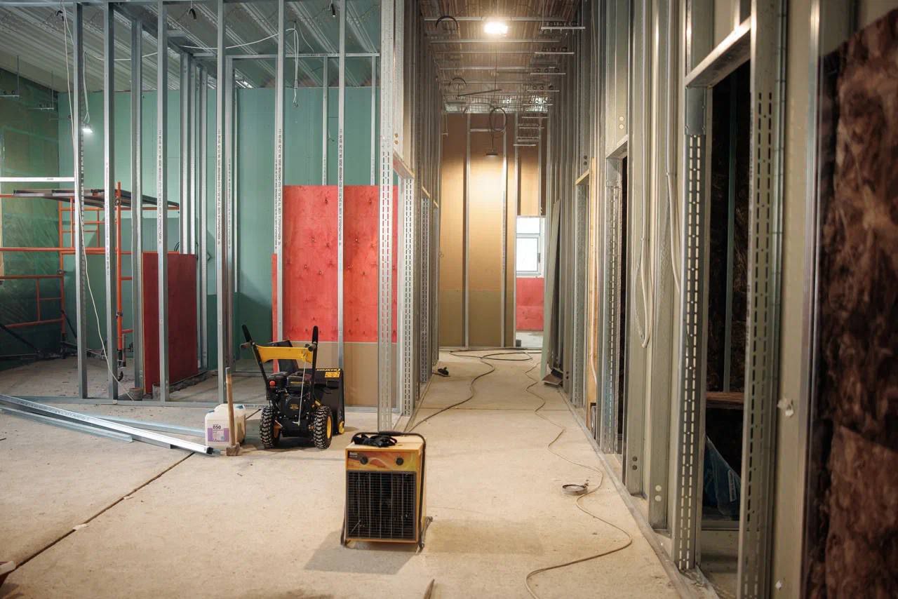 Внутри здания ведётся активная отделка, планировка помещений и монтаж внутренних сетей. Объект обеспечен электроснабжением по временной схеме.