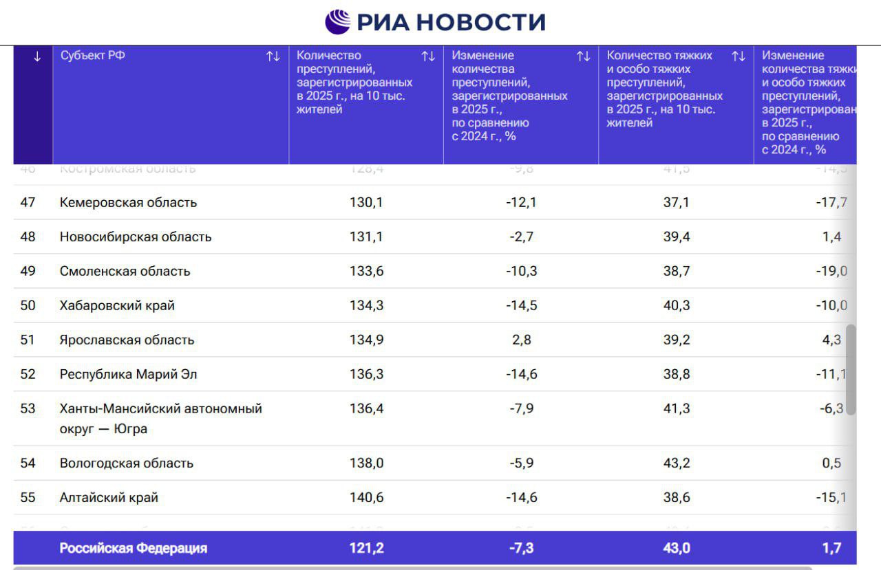 Всего же в 2025 году в России было зарегистрировано более 1,5 миллионов преступлений, что на 7,3% меньше, чем годом ранее.