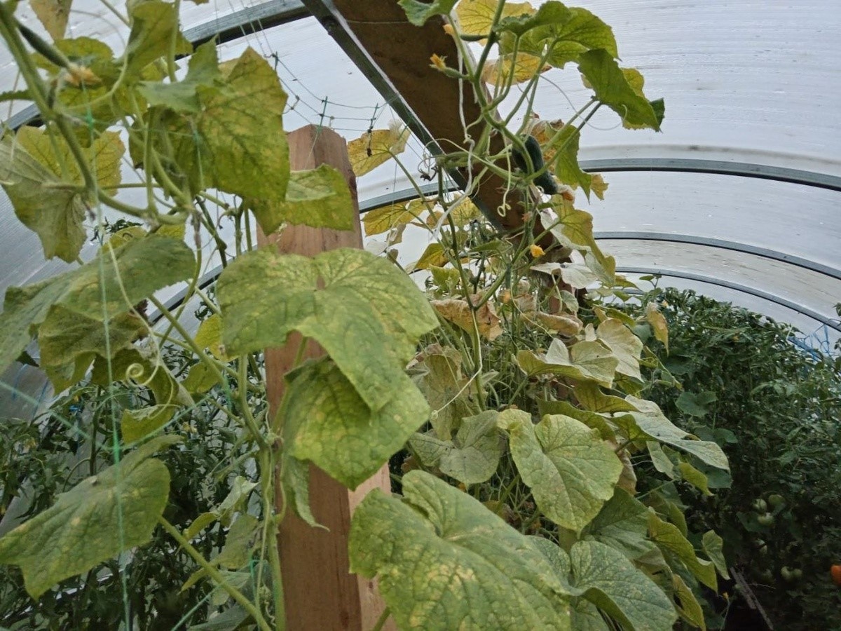 - Если вы заметили общее пожелтение и болезненный вид куста, это может быть признаком того, что ваши огурцы под атакой клеща.