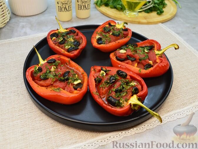 - Закуска из запечённого болгарского перца. Это блюдо придаст яркости благодаря сочетанию с помидорами, маслинами и ароматным чесноком. Добавленная свежая зелень подарит аппетитный аромат и не оставит никого равнодушным.