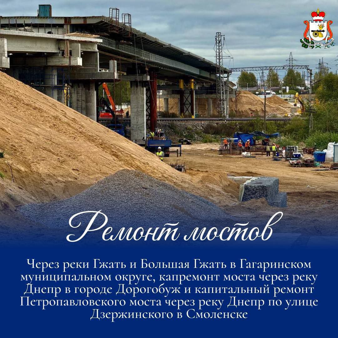 Кроме того, запланирован капитальный ремонт четырех мостов: через реки Гжать и Большая Гжать в Гагаринском муниципальном округе, капремонт моста через реку Днепр в городе Дорогобуж и капитальный ремонт Петропавловского моста через реку Днепр по улице Дзержинского в Смоленске.