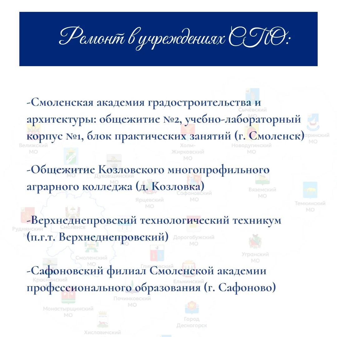 в общежитии 2, учебно-лабораторном корпусе 1 и блоке практических занятий Смоленской академии градостроительства и архитектуры, в общежитиях Козловского многопрофильного аграрного колледжа, Верхнеднепровского технологического техникума и Сафоновского филиала СмолАПО.