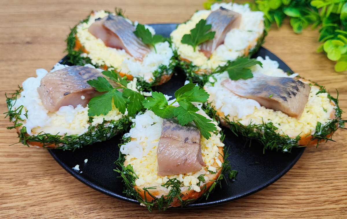 4. На одну сторону бутерброда выкладывается слой белка, на другую — слой желтка. Завершаем композицию кусочком сельди и украшаем маленькой веточкой петрушки.