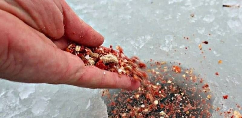 - Жмых: этот ингредиент насыщает смесь ароматом, который особенно привлекает рыбу в холодный период.