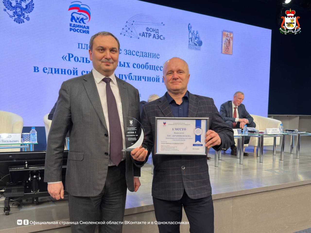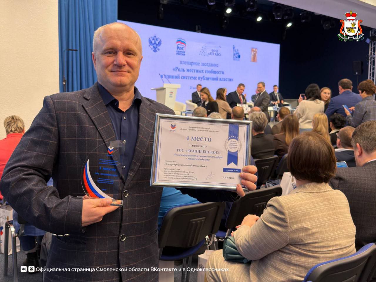 Территориальное общественное самоуправление «Крапивенское» из Монастырщинского муниципального округа заняло первое место во Всероссийском конкурсе «Лучшая практика гражданских инициатив». Проект благоустройства территории у местного озера стал победителем в номинации «Благоустройство и комфортная городская среда».