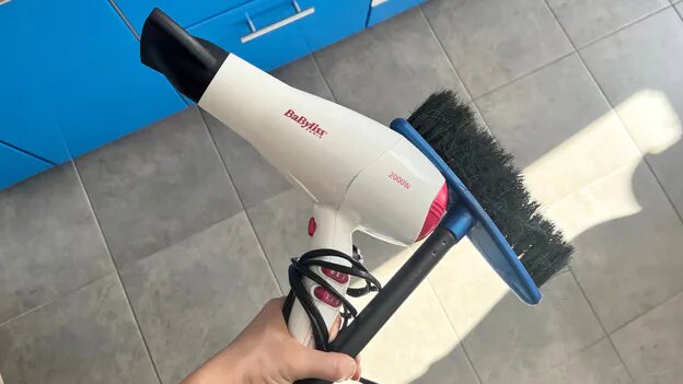 Чтобы эффективно удалить пыль с верхушек шкафов, нет необходимости становиться на лестницу. Для этого можно использовать внимательный трюк. Вам понадобится веник с длинной ручкой и фен. Закрепите фен на конце ручки венике при помощи прочной ленты, убедившись, что он держится надежно. Подключите фен к электросети — лучше использовать удлинитель, чтобы не ограничивать себя в движениях. Включите фен и направьте поток воздуха на поверхность шкафа: струя воздуха легко сдует пыль. Как только пыль окажется на полу, соберите её с помощью веничка и совка или пылесоса.