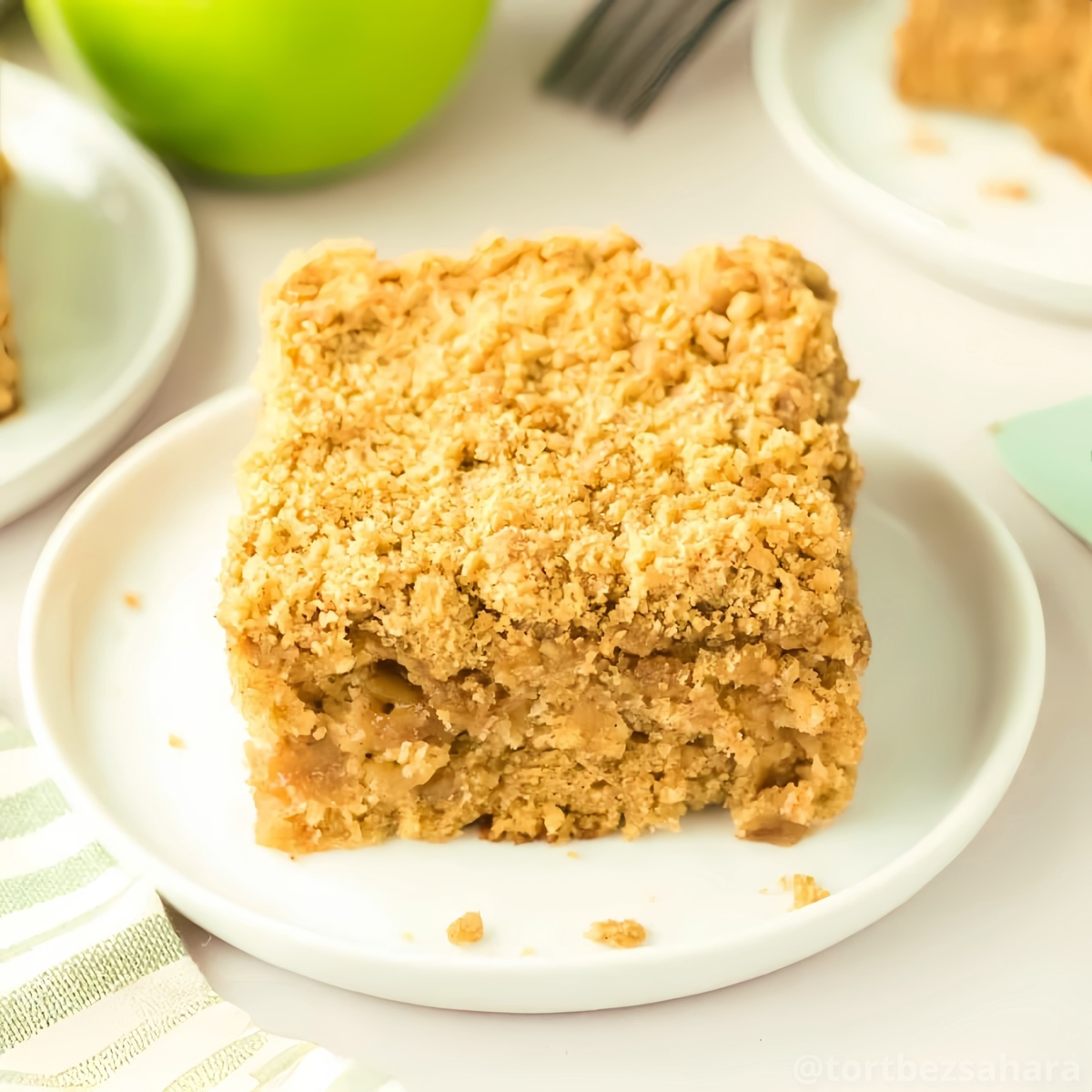Крошка сверху добавляет хруст, а яблочная начинка держится вместе благодаря муке и корице. В результате выходит пирог, который легко подстраивается под обычный вечер: можно выбрать другие фрукты по сезону или заменить сахар на более натуральный заменитель.
