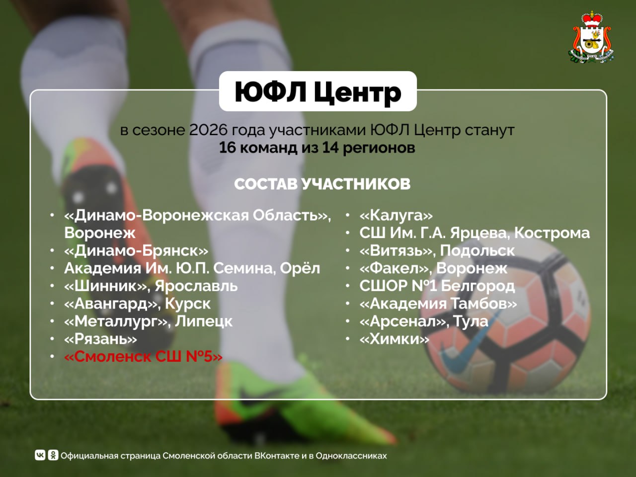 Российский футбольный союз утвердил состав участников ЮФЛ на сезон 2026 года. В турнире высшего уровня для юношеских команд страны выступят 74 школы из 56 регионов. Команда «Футбольная школа Смоленской области» официально вернулась в ЮФЛ «Центр» после двухлетнего перерыва.