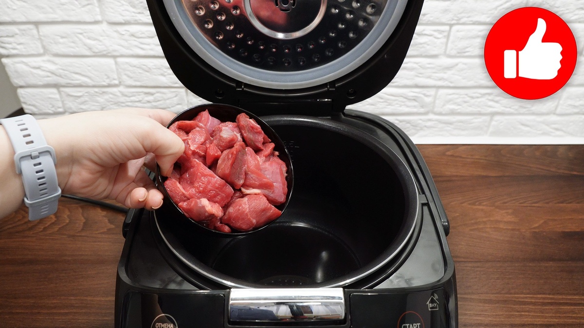 Для начала в чашу мультиварки наливается подсолнечное масло, после чего добавляется говядина и холодная вода. Устанавливаем режим «Тушение» или «Мультиповар» на 110°C и готовим в течение 1,5 часов.