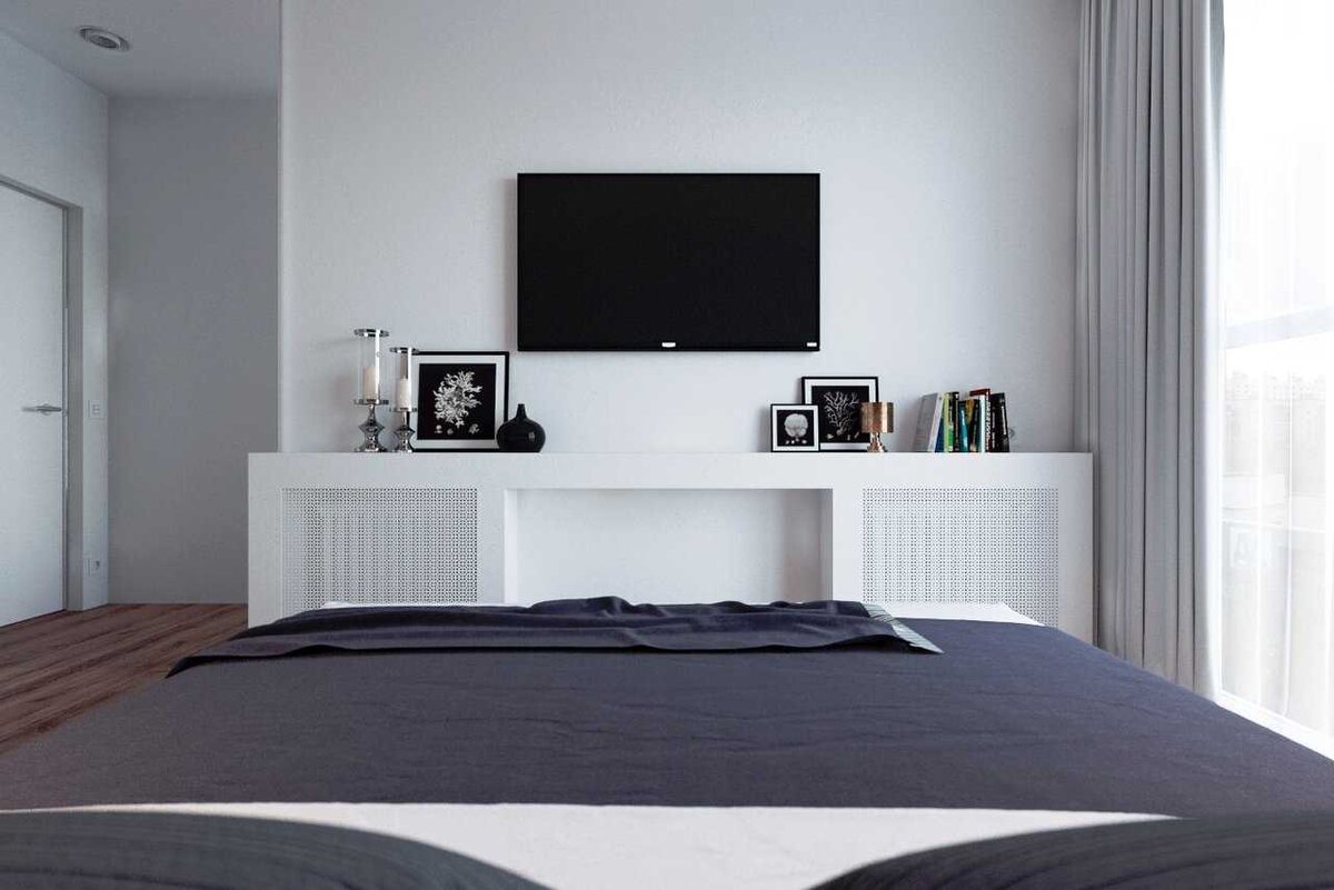 - Многофункциональное пространство. Сегодня спальни часто перестают быть только местом для сна. Телевизор может стать естественным дополнением к домашнему офису или библиотеке.