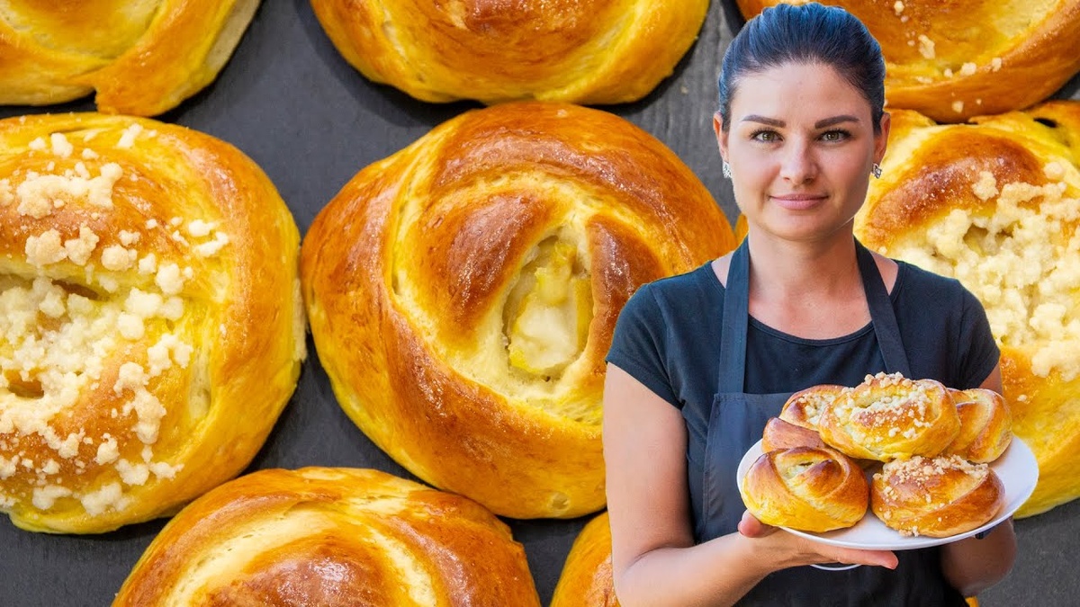 Когда тесто поднялось, его обминают и делят на равные порции. Каждую часть раскатывают, затем делают надрезы и выкладывают начинку. Скругленные булочки ставят на противень для финального подъема, смазывают желтком с молоком и посыпают штрейзелем.