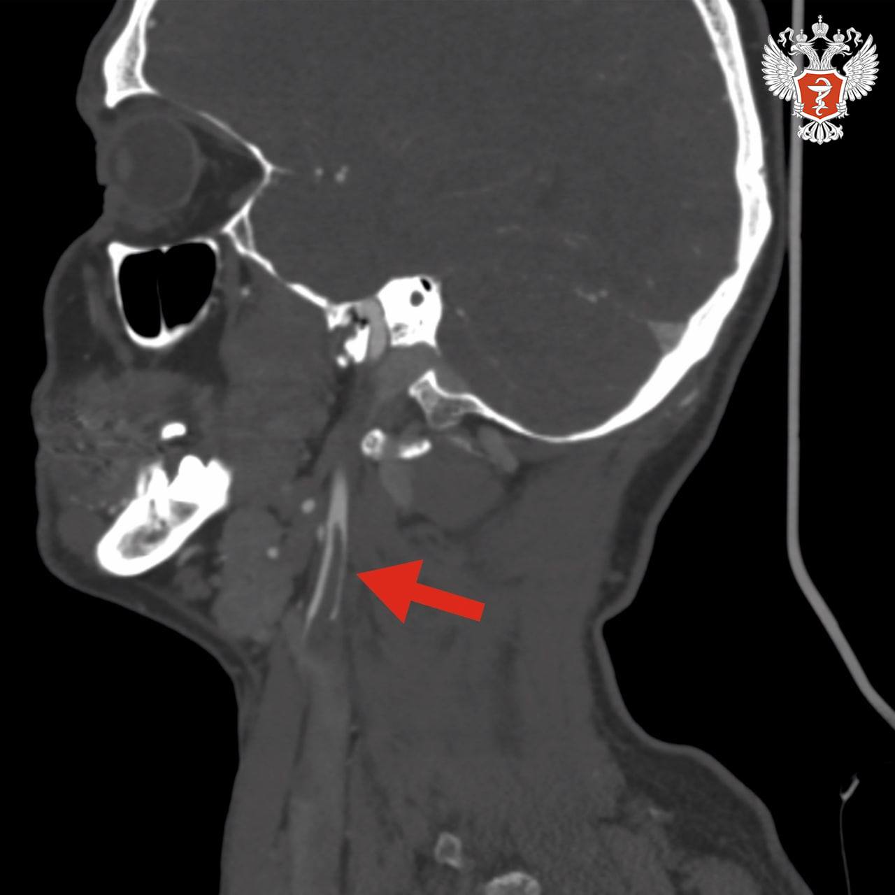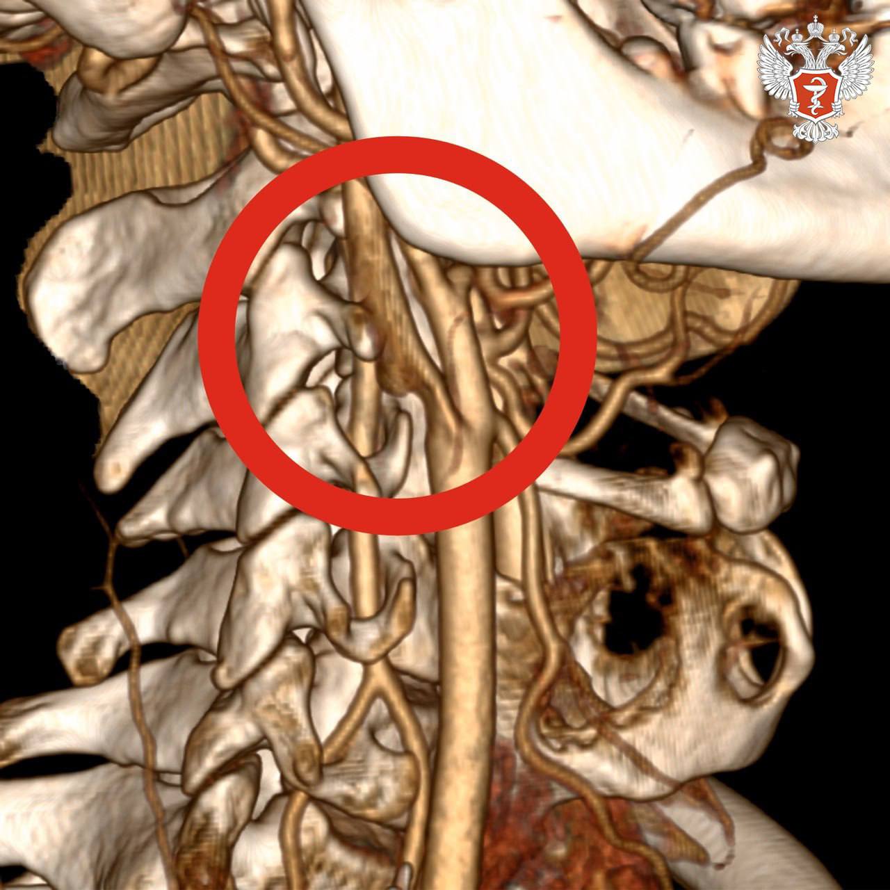 В ходе исследований врачи выявили тромб длиной около 4 см в просвете правой внутренней сонной артерии. Он нарушал кровоснабжение головного мозга. В любой момент тромб мог оторваться и закрыть магистральные артерии правого полушария, что привело бы к обширному ишемическому инсульту.