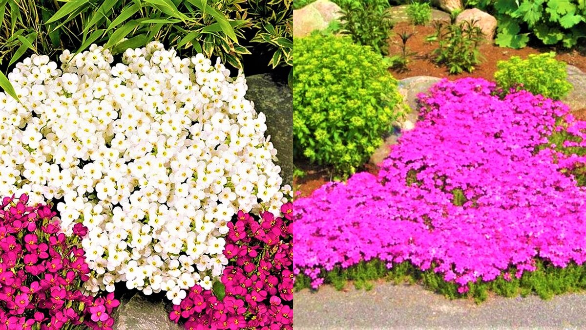 Первым на очереди стоит арабис, который легко создаёт цветочные ковры. Низкорослое почвопокровное растение с яркими белыми, лиловыми и розовыми цветами идеально подходит для оформления клумб и дорожек. Его высота не превышает 30 см, а цветение приходится на май-июнь. Примечательно, что арабис не только красив, но и приятно пахнет.