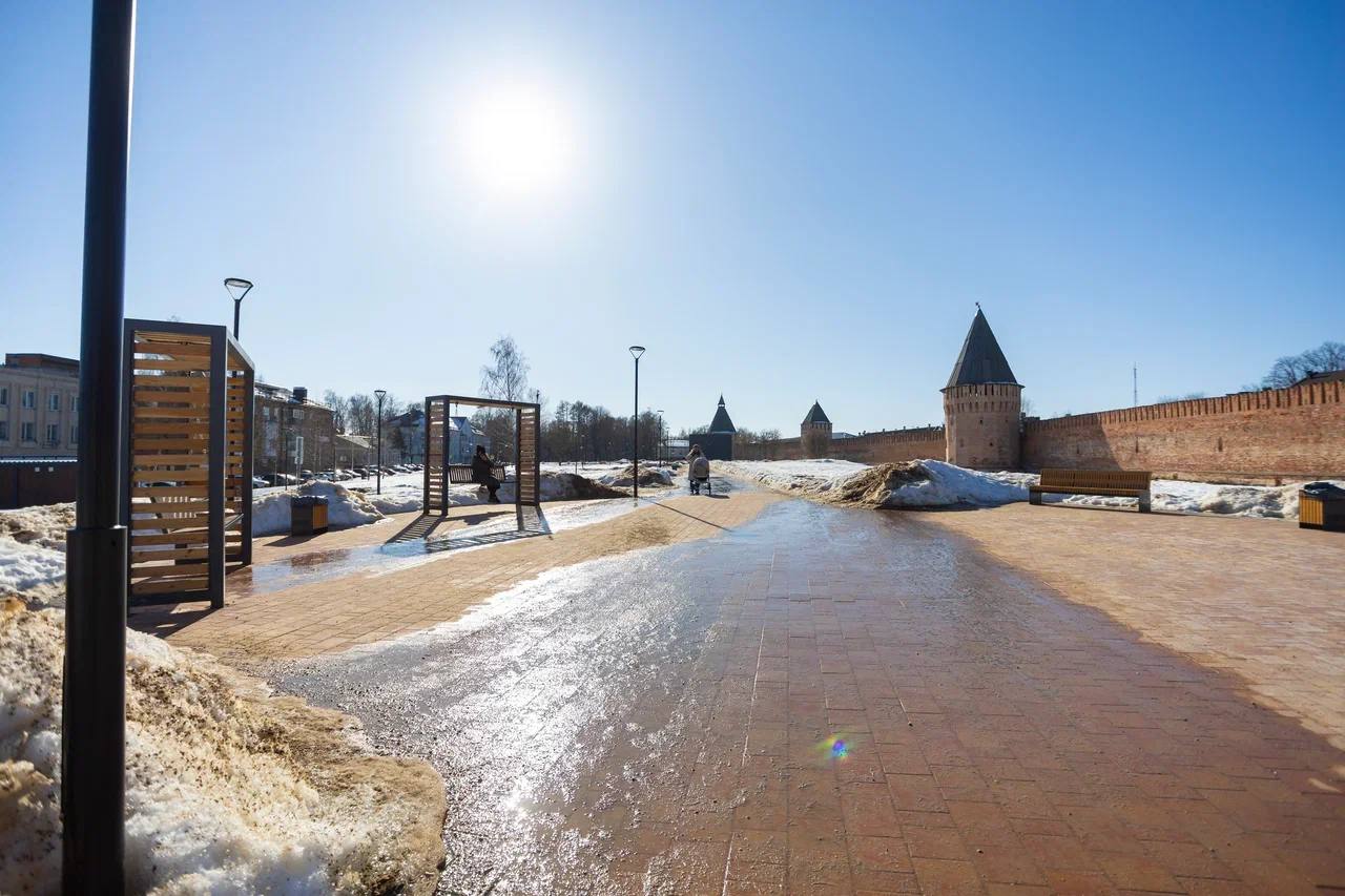 Сквер имени Шеина — одно из самых атмосферных мест в нашем городе. У восточного участка крепостной стены всегда многолюдно: здесь гуляют с детьми, назначают встречи, приходят полюбоваться видами древних башен. Прошлый этап благоустройства уже преобразил территорию — появились пешеходные дорожки, освещение, подсветка самой стены, лавочки и всесезонный мультимедийный экран.