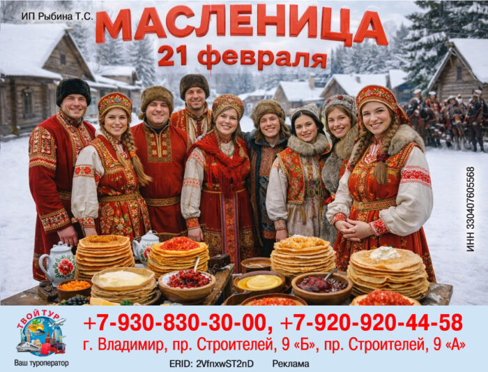 Зима постепенно отступает, и самое время впустить в жизнь яркие эмоции. 21 февраля компания «Твой Тур» приглашает всех на незабываемую Масленицу, где вас ждут весёлые игры и ароматные блины. Путешествие состоится в усадьбе «Богдарня» в живописной Владимирской области.