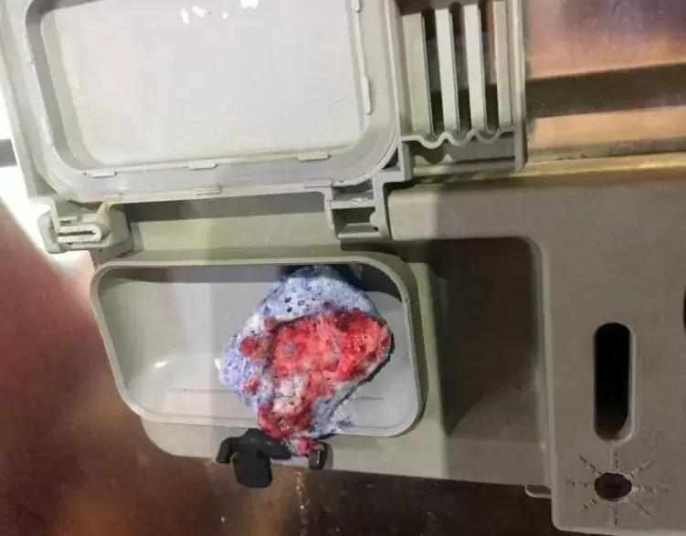 - Забитый или загрязнённый дозатор. Если на дверце накопился жир или остатки пищи, это может помешать полной открываемости лотка с таблеткой.