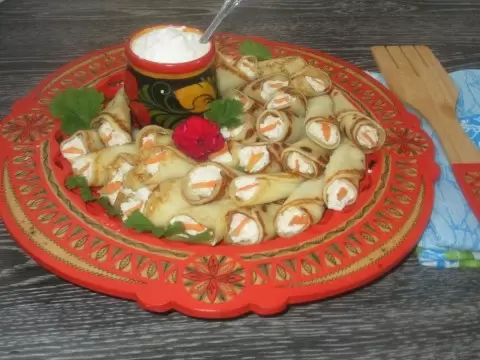 Изготовленные блинчики наполняются начинкой, сворачиваются и укладываются на тарелку. Особым штрихом в оформлении могут стать натертые на крупной терке морковные полоски, которые красиво дополнят ваше блюдо.
