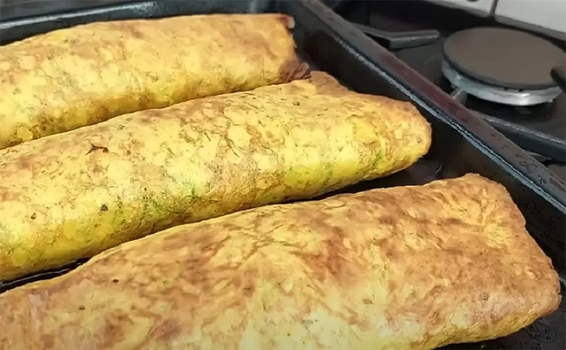 В отдельной ёмкости следует соединить яйца с отжатым кабачком, влить немного молока и добавить крахмал. Массу тщательно перемешать, а затем на разогретую сковороду выложить небольшие порции теста и обжарить до золотистой корочки. Начинку укладывать на обжаренные блинчики, заворачивать и размещать в форме для запекания. Блюдо должно запекаться около получаса в духовке при температуре 180 °C.