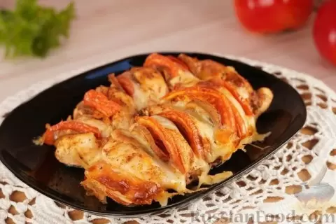 - Гармошка из куриного филе с грибами и помидорами. Эта закуска станет настоящим хитом праздника. Филе курицы надрезают гармошкой, фаршируют сочными помидорами и шампиньонами, а затем запекают до золотистой корочки. Освежающий вкус начинки придаст особый шарм этому блюду.