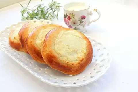 - Для начинки: жирный творог (350 г), сахар (2–3 ст. ложки), яйцо (1 шт.), ванильный сахар (1 ч. ложка), сметана (1 ст. ложка) и по желанию изюм, курага или лимонная цедра.