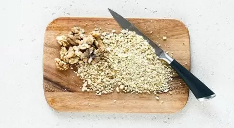 - Грецкие орехи — их нужно мелко измельчить в блендере или скалкой, а затем пересыпать в глубокую миску.