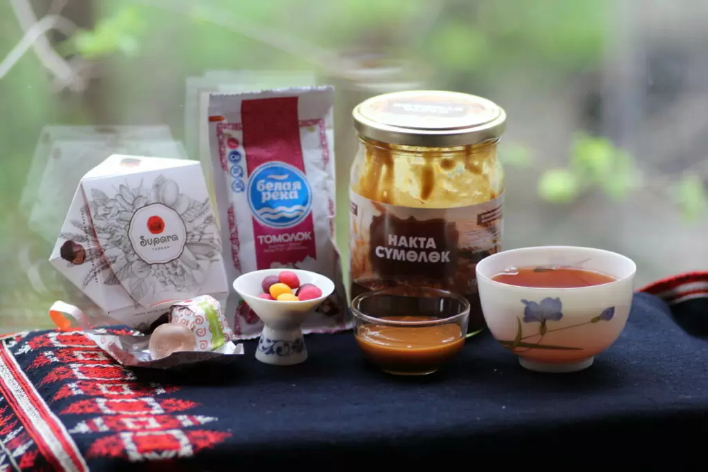 Это драже из сушеного творога, облаченного в глазурь различных вкусностей: молочной, облепиховой, брусничной, клубничной и черничной. Сверкающие разноцветные конфетки похожи на Skittles, но на вкус они напоминают курт — лишь более нежные и с ярко выраженными ягодными оттенками. Томолок станет отличной закуской для чаепитий на свежем воздухе. Чай на берегу с такими лакомствами — это настоящее наслаждение.