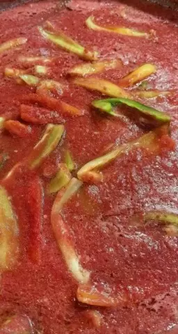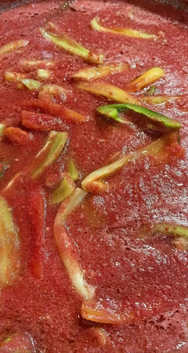 - В большой кастрюле разогрейте томатное пюре до кипения. Добавьте сахар, соль, перец горошком и растительное масло. Варите на медленном огне 15 минут.