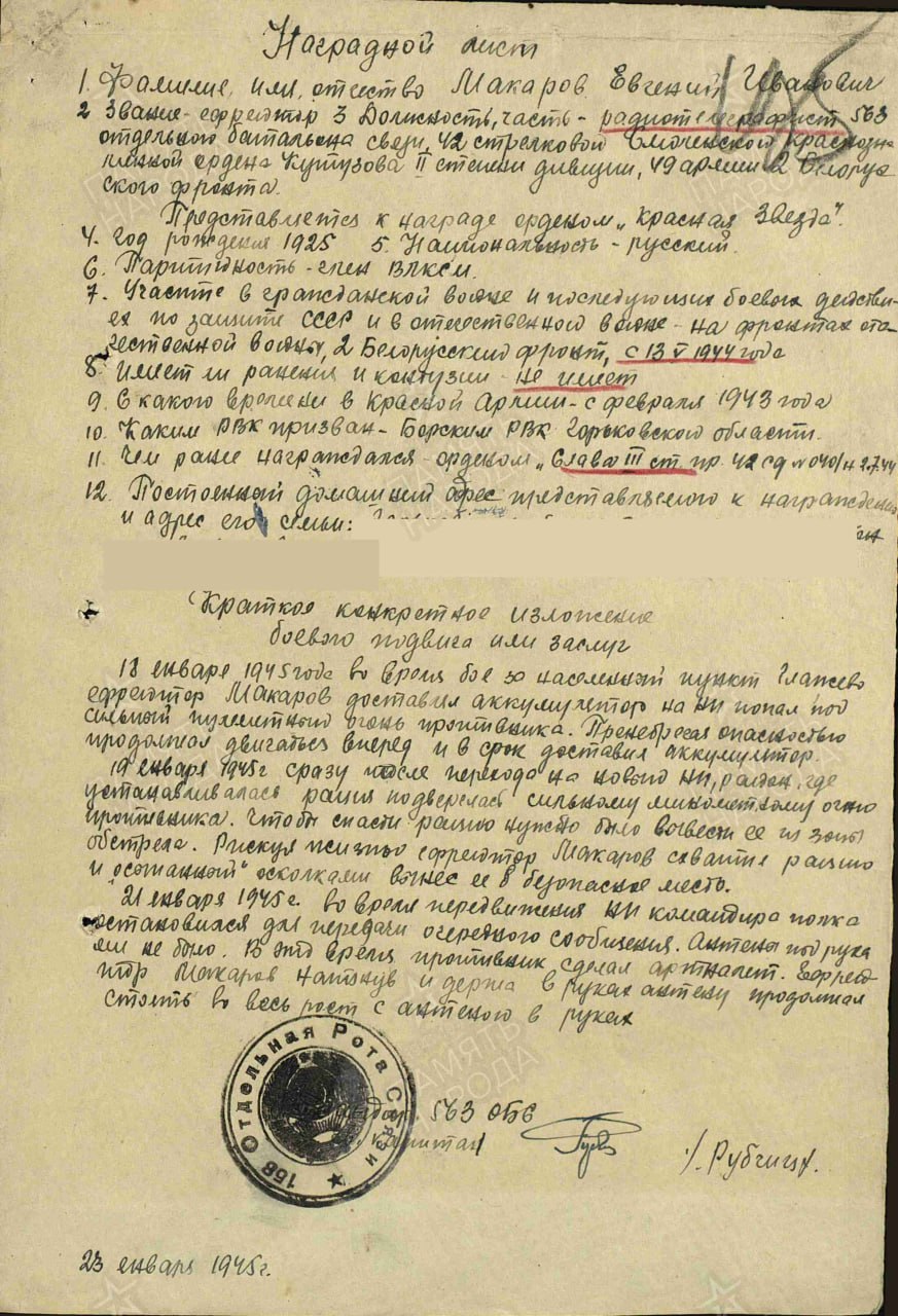 В наградном документе к Ордену Красной Звезды от 23 января 1945 года записано, что 18 января ефрейтор Макаров под пулеметным огнем противника в срок доставил на НП аккумулятор; 19 января, рискуя жизнью, вынес из-под обстрела рацию. А 21 января, во время артналета, натянув и держа в руках антенну, стоял во весь рост с антенной в руках, чтобы командир полка смог передать важное сообщение.