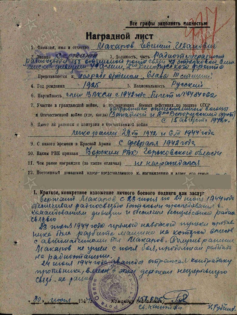 В представлении к Ордену Славы III степени сообщается: летом 1944 года прямой наводкой пушки противника была разбита машина, на которой вместе с автоматчиками был тов. Макаров. Получив ранение, Макаров не ушел с поля боя и продолжал работать на радиостанции, а уже на следующий день дважды принял участие в отражении атаки врага, держа неразрывную связь на рации.