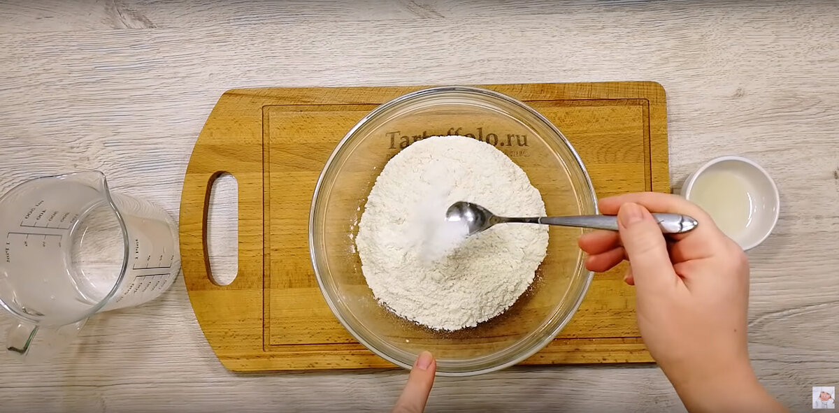 - В миске смешать 200 граммов муки и полную чайную ложку соли.