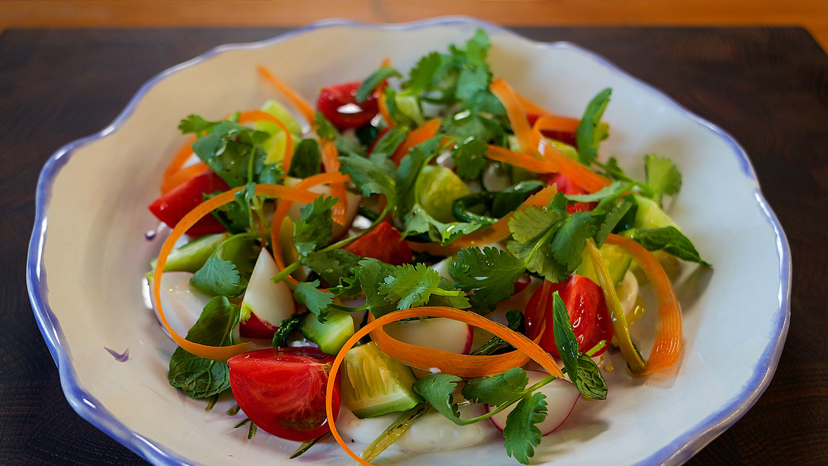 Чтобы создать это кулинарное произведение, начните с нарезки редиски и томатов дольками. Четверть моркови аккуратно нарежьте с помощью овощечистки на тонкие полоски и поместите их в миску с водой. Оставшуюся половину огурца порежьте произвольно для придания еще больше текстуры. Черемшу слегка обжарьте на растительном масле, а затем обожгите с помощью газовой горелки, чтобы смягчить ее выраженный вкус.