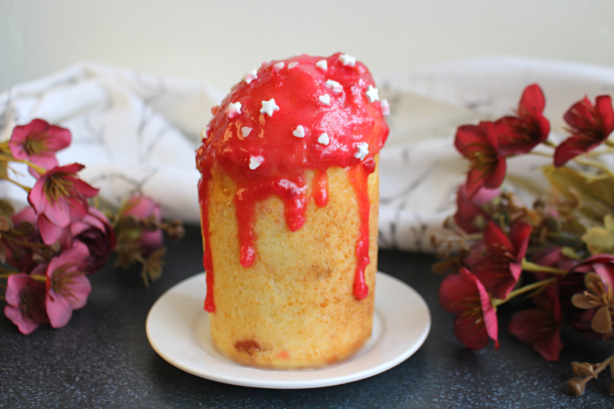 По окончании выпечки, куличи нужно остудить. Для украшения используют ягодную глазурь. Наносим глазурь после полного остывания, даем первому слою немного высохнуть, затем наносим второй слоем. Завершаем оформление с помощью кулинарной посыпки.